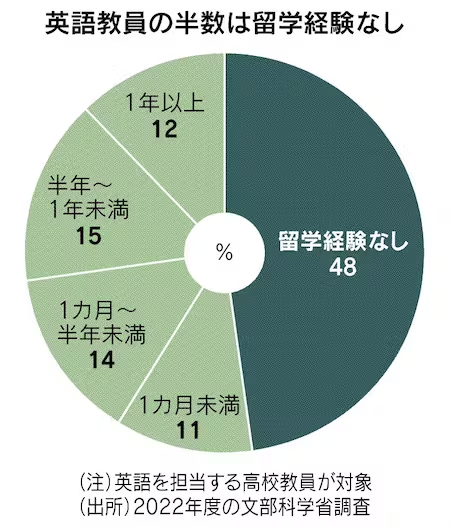 半年以上の留学経験がある英語教員は高校で27%にとどまる。教員養成課程の必修単位数が多い上に内容が指導法などに偏り、長期留学との両立は難しい。